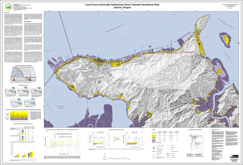 The Oregon Department of Geology and Mineral Industries (DOGAMI) has been identifying and mapping the tsunami inundation hazard along the Oregon coast since 1994. In Oregon, DOGAMI manages the National Tsunami Hazard Mitigation Program, which has been administered by the National Oceanic and Atmospheric Administration (NOAA) since 1995. DOGAMI’s work is designed to help cities, counties, and other sites in coastal areas reduce the potential for disastrous tsunami-related consequences by understanding and mitigating this geologic hazard. Using federal funding awarded by NOAA, DOGAMI has developed a new generation of tsunami inundation maps to help residents and visitors along the entire Oregon coast prepare for the next Cascadia Subduction Zone (CSZ) earthquake and tsunami.