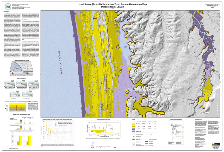 The Oregon Department of Geology and Mineral Industries (DOGAMI) has been identifying and mapping the tsunami inundation hazard along the Oregon coast since 1994. In Oregon, DOGAMI manages the National Tsunami Hazard Mitigation Program, which has been administered by the National Oceanic and Atmospheric Administration (NOAA) since 1995. DOGAMI’s work is designed to help cities, counties, and other sites in coastal areas reduce the potential for disastrous tsunami-related consequences by understanding and mitigating this geologic hazard. Using federal funding awarded by NOAA, DOGAMI has developed a new generation of tsunami inundation maps to help residents and visitors along the entire Oregon coast prepare for the next Cascadia Subduction Zone (CSZ) earthquake and tsunami.