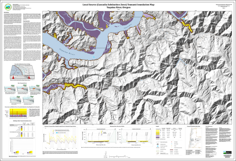 The Oregon Department of Geology and Mineral Industries (DOGAMI) has been identifying and mapping the tsunami inundation hazard along the Oregon coast since 1994. In Oregon, DOGAMI manages the National Tsunami Hazard Mitigation Program, which has been administered by the National Oceanic and Atmospheric Administration (NOAA) since 1995. DOGAMI’s work is designed to help cities, counties, and other sites in coastal areas reduce the potential for disastrous tsunami-related consequences by understanding and mitigating this geologic hazard. Using federal funding awarded by NOAA, DOGAMI has developed a new generation of tsunami inundation maps to help residents and visitors along the entire Oregon coast prepare for the next Cascadia Subduction Zone (CSZ) earthquake and tsunami.