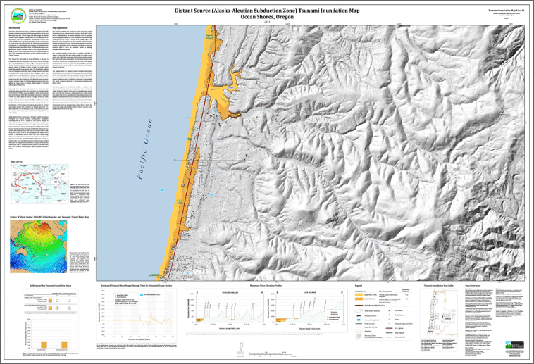 The Oregon Department of Geology and Mineral Industries (DOGAMI) has been identifying and mapping the tsunami inundation hazard along the Oregon coast since 1994. In Oregon, DOGAMI manages the National Tsunami Hazard Mitigation Program, which has been administered by the National Oceanic and Atmospheric Administration (NOAA) since 1995. DOGAMI’s work is designed to help cities, counties, and other sites in coastal areas reduce the potential for disastrous tsunami-related consequences by understanding and mitigating this geologic hazard. Using federal funding awarded by NOAA, DOGAMI has developed a new generation of tsunami inundation maps to help residents and visitors along the entire Oregon coast prepare for the next Cascadia Subduction Zone (CSZ) earthquake and tsunami.